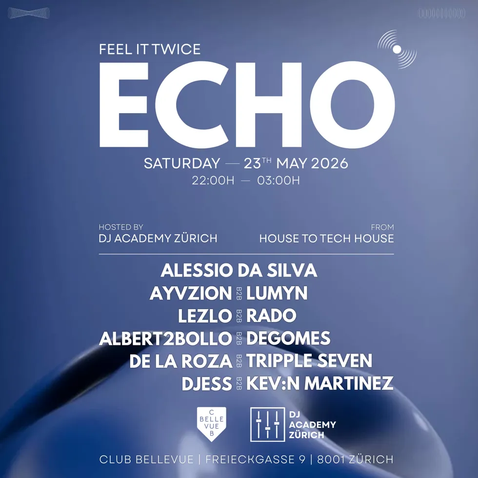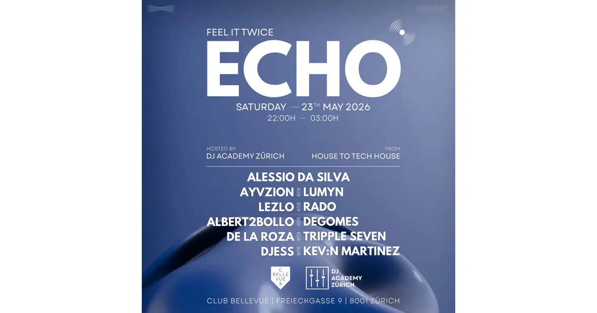 Feel it twice: Am Samstag, den 23. Mai 2026, lädt „ECHO“ in den Club Bellevue in Zürich ein – eine Nacht, die ganz im Zeichen von Rhythmus, Wiederholung und kollektiver Energie steht.